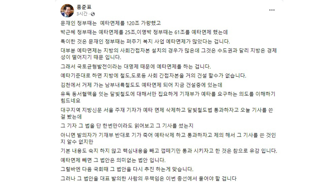홍준표 시장은 1월 12일 자신의 페이스북에서 "문재인 정부 때는 예타 면제를 120조가량 했고 박근혜 정부 때는 25조, 이명박 정부 때는 61조를 각각 예타 면제했다"며 "특이한 것은 문재인 정부 때는 퍼주기 복지 사업 예타 면제가 많았다는 것"이라며 이같이 밝혔습니다.