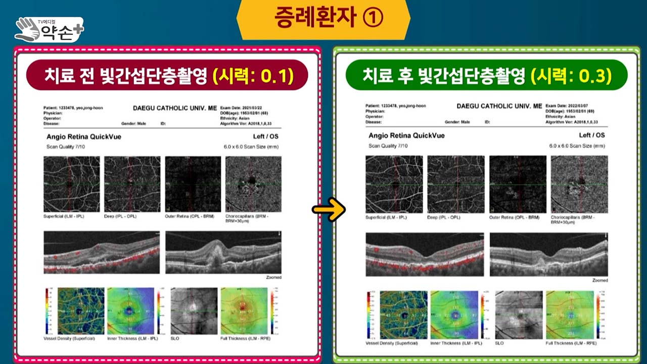 83세 남자 환자인데요. 일주일 전부터 좌측 눈에 시력 저하를 주소로 해서 병원에 내원하신 분입니다. 시력이 0.1로 떨어져 있고요. 이 사진을 보시면 아시겠지만 새카맣게 보이는 부분도 있고 희게 보이는 부분도 있고 형태가 좀 다르죠? 그래서 이런 형태로 왔습니다만, 저희가 제일 중요한 검사가 아까 OCT라고 이야기를 드렸습니다. 그래서 이 환자의 OCT 검사를 해보면 이렇게 망막 밑에 피와 그다음에 물과 그다음에 여러 가지 어떤 조직의 변화들이 보이는 그림을 보여주는데요. 이 사진상에서도 신생혈관이 보이는 그림들인데요. 습성 형태의 황반변성으로 진단을 내리고 주사 치료를 시작을 했습니다. 몇 번의 치료 후, 주사 치료 후에 보시면 거의 많은 부분이 소실이 되고 좋아지는 모습을 직관적으로 보실 수 있죠.