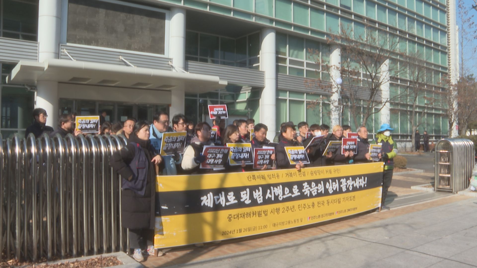민주노총 대구·경북지역본부는 "그동안 법적용이 유예됐던 50인 미만 사업장과 공사대금 50억 원 미만 건설 현장에서 중대재해가 상당수 발생해 왔다"며 "유예 연장 없이 모든 사업장에 중대재해법이 적용돼야 한다"고 밝혔습니다.
