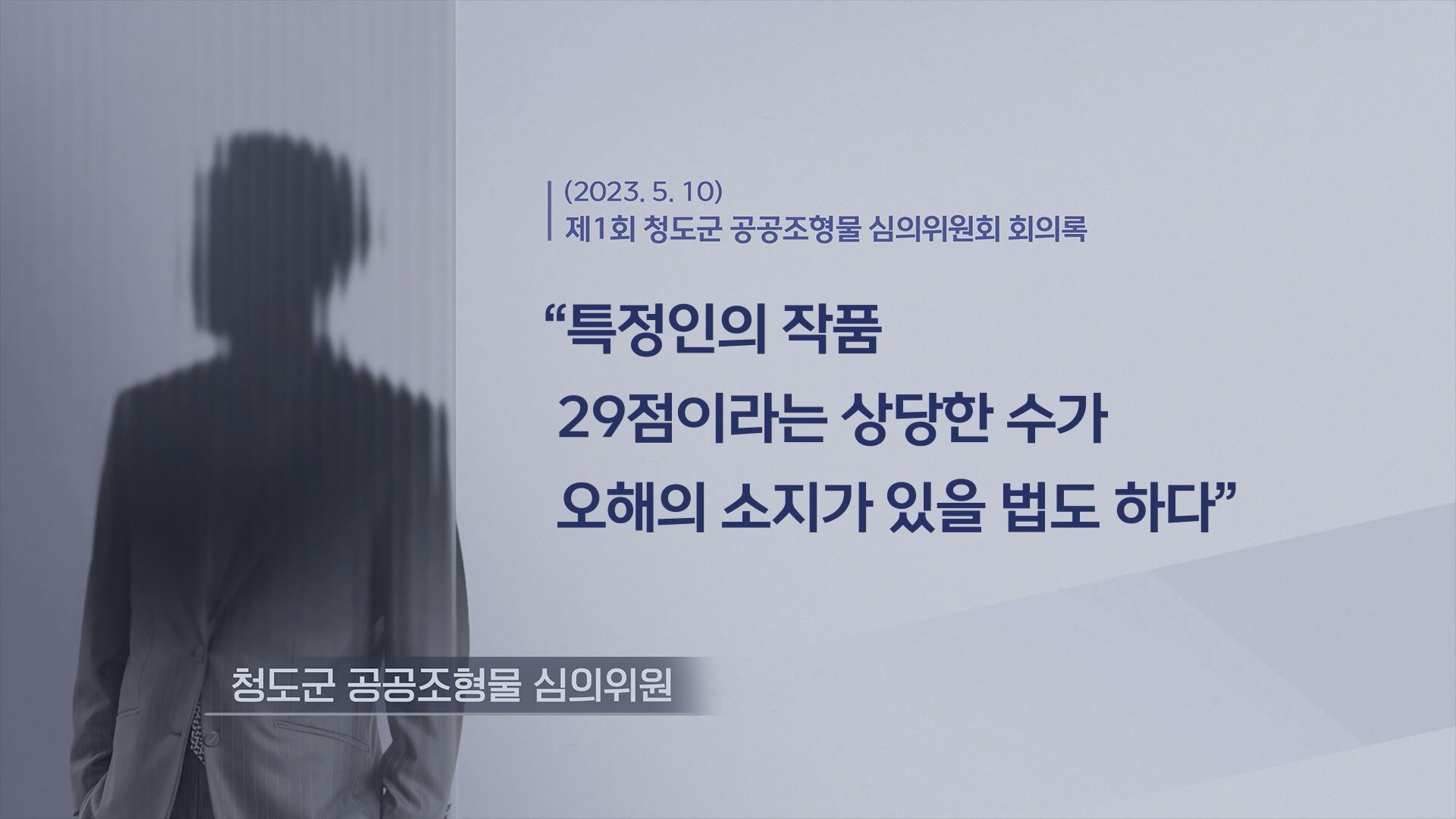 청도군의회 이승민 의원은 지난해 5월 10일 청도군에서 열린 공공조형물 심의위원회 회의에서 "특정 작가하고 이미 다 계약하고 일을 진행하고 있어 납득이 가지 않는다"라며 특혜 의혹을 제기했습니다.