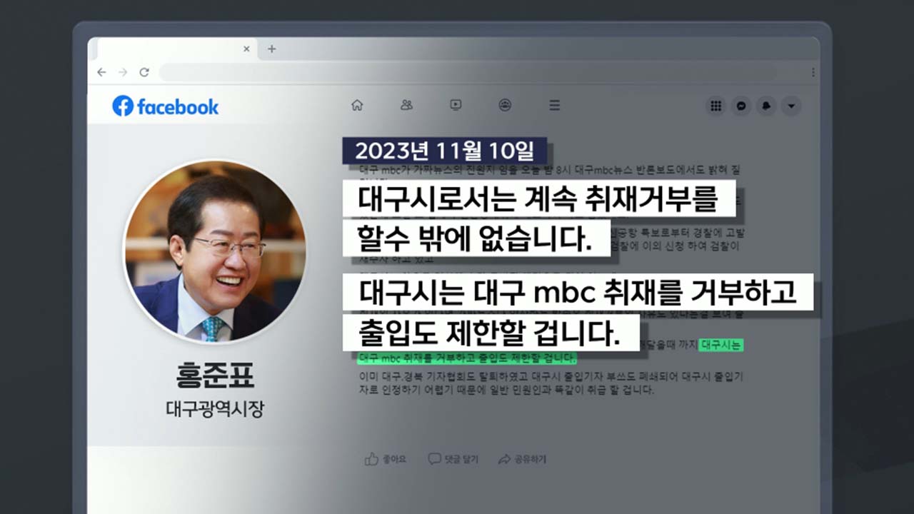 홍 시장은 대구MBC가 여러 차례 왜곡, 편향 보도에도 참아왔지만 500만 대구·경북 시도민의 염원을 짓밟는 작태를 바로 잡겠다며 취재 거부 뜻을 밝혔습니다.