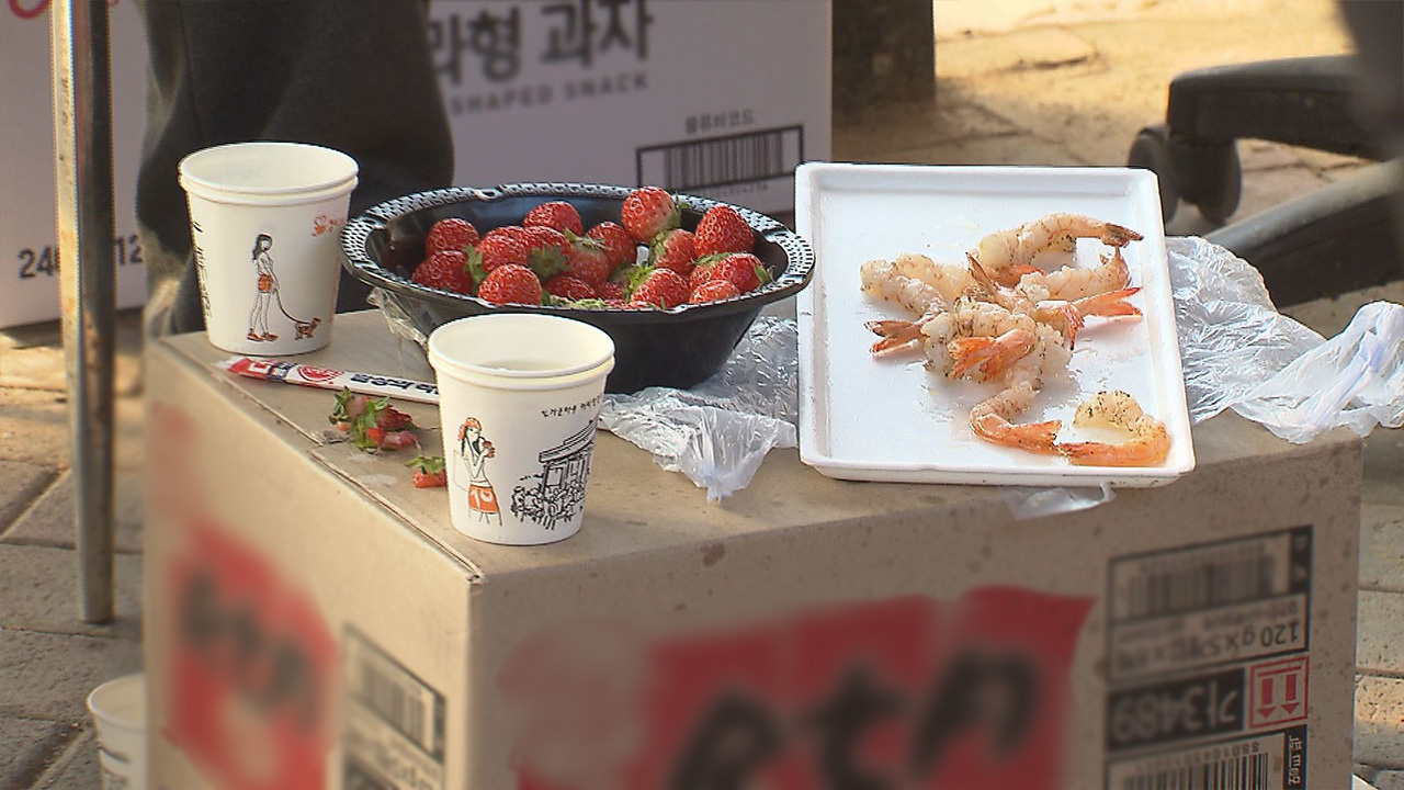 한가운데 덩그러니 놓인 상자 위에는 딸기와 새우, 그리고 술이 든 종이컵이 놓였습니다.