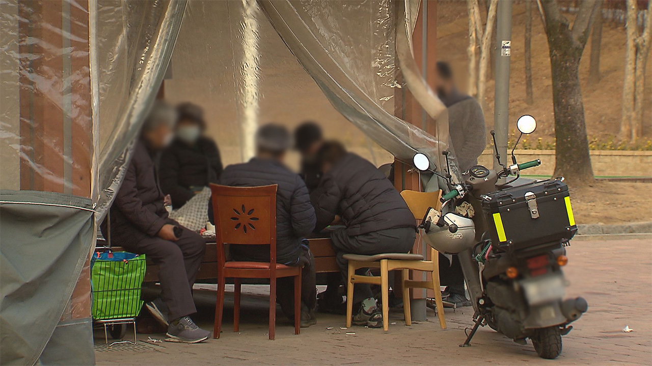 하지만, 어르신들은 공원 정자에 직접 방한 비닐까지 두르고 대낮 술판을 벌입니다.