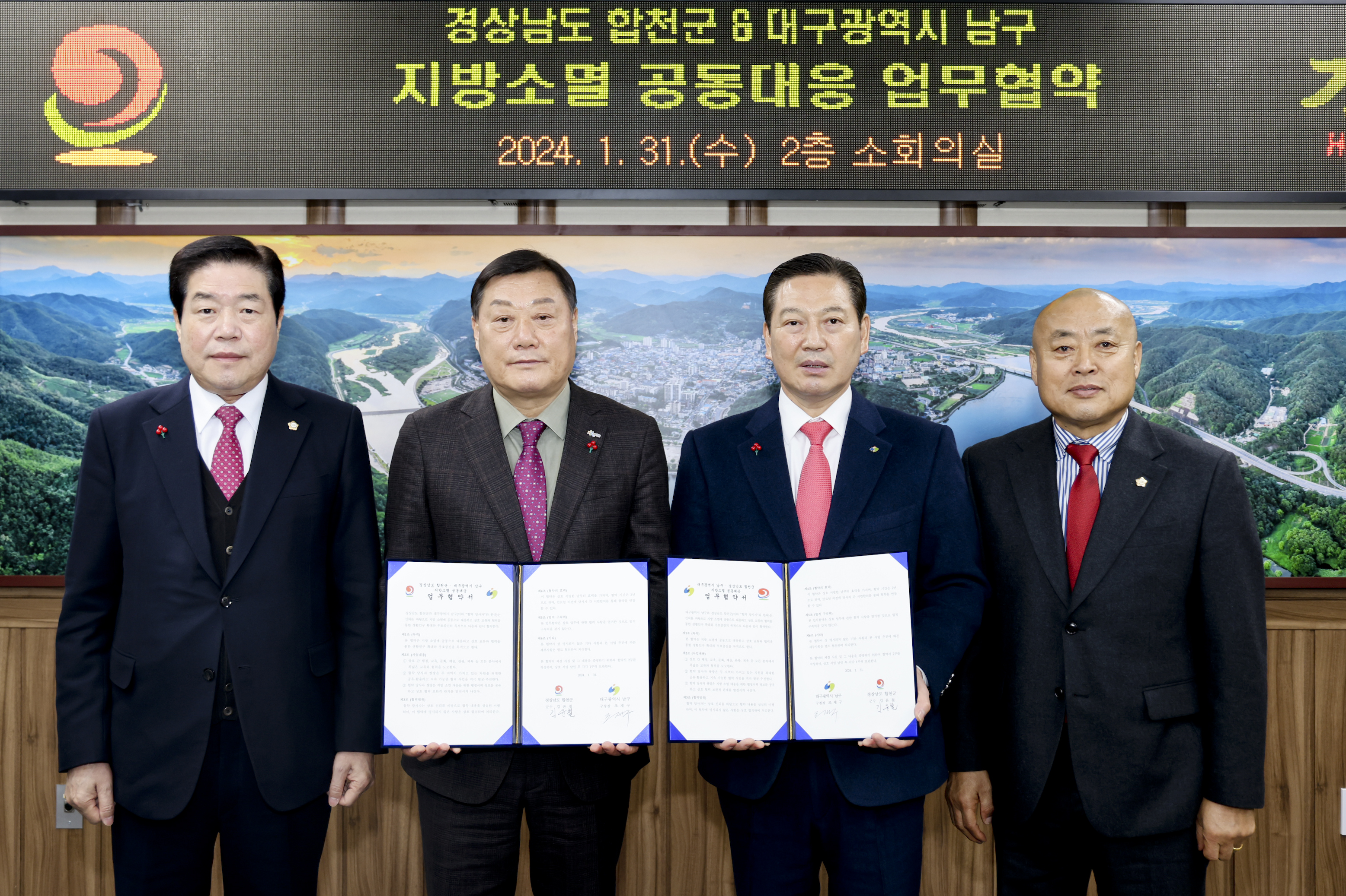 대구 남구와 경남 합천군은 1월 31일 오후 합천군청에서 지방 소멸 공동 대응을 위한 업무협약을 맺었습니다.