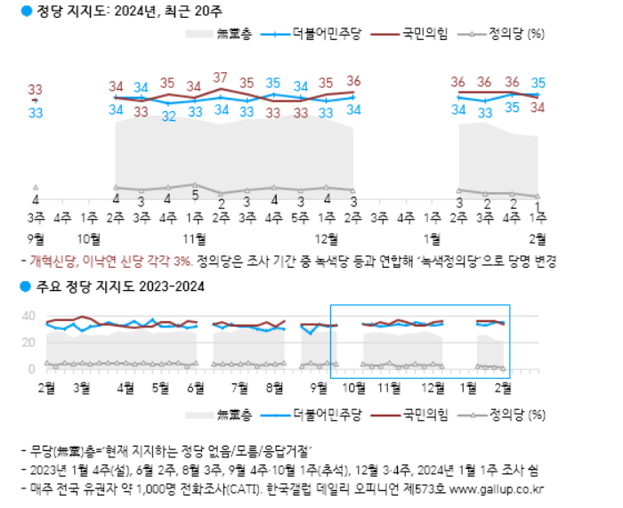 한국갤럽이 2024년 2월 첫째 주, 1월 30일에서 2월 1일까지 전국 만 18세 이상 유권자 천 명을 대상으로 조사한 결과입니다.