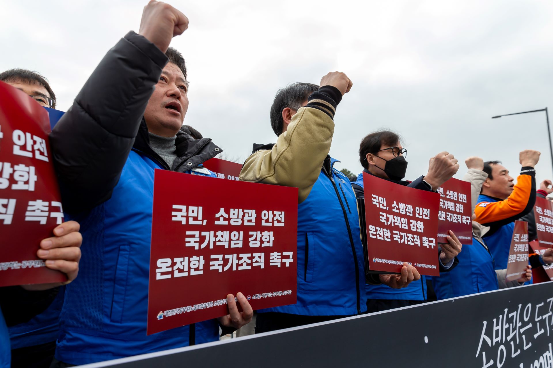 대한민국공무원노동조합총연맹(공노총) 소방노조와 소방을사랑하는공무원노동조합(소사공노)은 2월 7일 서울 용산구 대통령실 앞에서 기자회견을 열고 "연례행사처럼 반복되는 소방공무원의 순직을 더는 묵과할 수 없다"며 "재발 방지를 위해서라도 정부 조직 개편을 통해 소방 조직을 온전한 국가직으로 전환할 것을 강력히 요구한다"고 밝혔습니다.