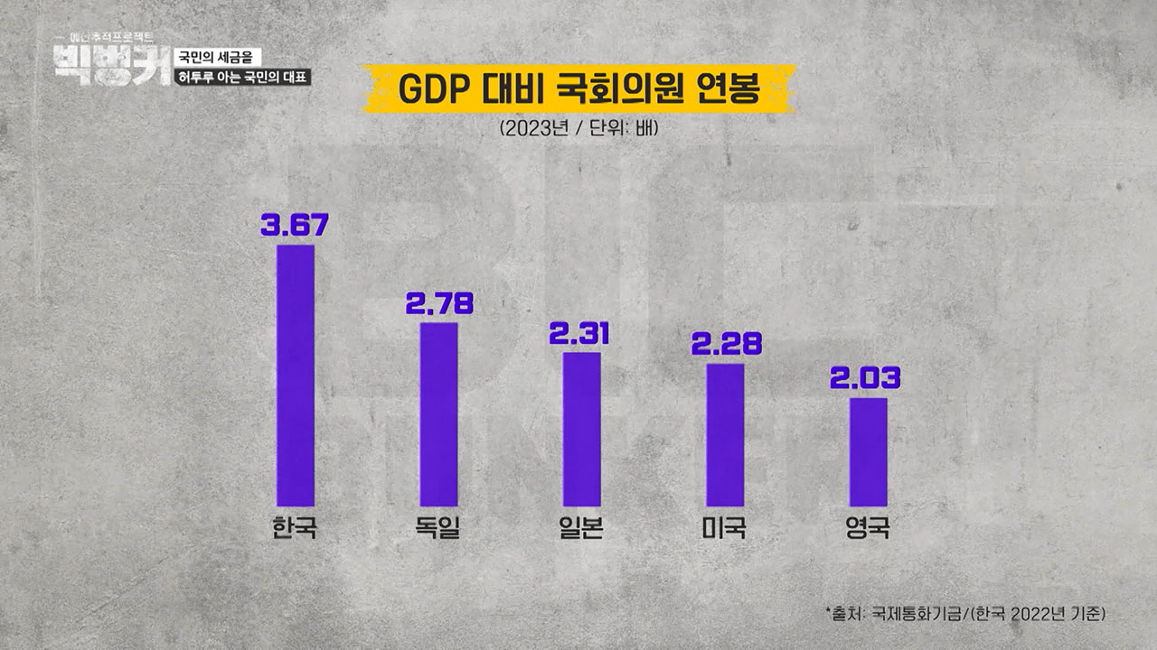 이탄희 의원의 말처럼 우리나라 국회의원 연봉은 세계 최고 수준일까요? 2023년 기준으로 보면 1인당 의원 보수가 가장 높은 미국의 경우 1인당 174,000달러로 우리나라 돈으로 약 2억 3천만 원이었습니다. 그리고 일본이나 독일도 우리나라보다 높았고, 영국, 노르웨이, 덴마크 등이 우리보다 낮은 것으로 나타났습니다. 그런데 GDP 대비 국회의원 연봉을 비교해 봤을 때 한국은 3.67배로, 독일 2.78배, 일본 2.31배, 미국이 2.28배인 것에 비해 훨씬 높은 것으로 나타났습니다.