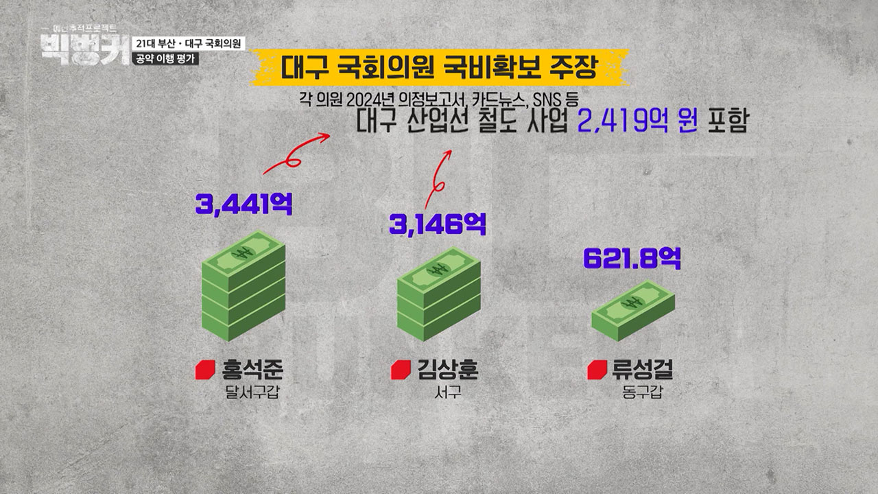우지영 나라살림연구소 수석연구위원 "부산에서는 김도읍 의원이 1조 2,283억 원을 확보했다고 하는데요, 좀 쉽게 체감할 수 있게 비교를 해드리면 부산시 북구와 강서구, 2개 구의 2024년 한 해 예산을 합한 게 1조 942억 원 정도인데, 2개 자치구의 한 해 예산보다 더 큰 액수의 국비를 따왔다는 거거든요? 가덕도 신공항처럼 단위가 큰 사업이 포함돼서 그런 건데, 이게 본인의 성과라고 말하는 게 맞는 건지 의문이고요, 대구에서 가장 많은 국비를 확보했다고 주장한 의원이 3,441억 원을 따온 홍석준 의원인데, 여기에서 대구산업선철도 국비 2,419억 원이 김상훈 의원과 겹치는 예산이 있어요. 그런데 이런 자세한 내용은 알리지 않고 마치 본인의 성과인 것처럼 광고하고 있는데요, 이와 같은 모습들을 두고 총선을 앞두고 민심을 확보하려고 공을 부풀렸다는 지적들도 있습니다"
