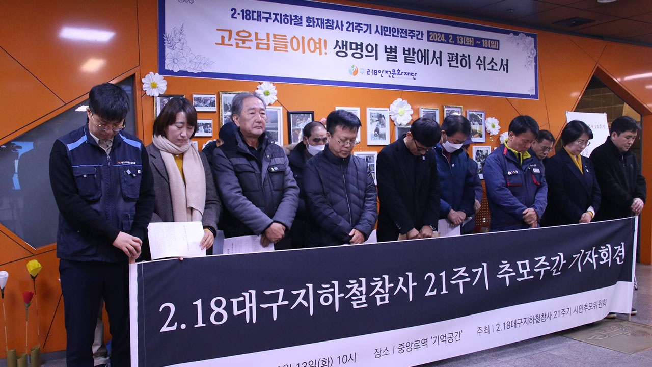 2024년으로 대구 지하철 참사는 21주기가 되었습니다. 대구 지하철 참사는 2003년 2월 18일 오전 9시 53분 도시철도 1호선 중앙로역 안심 방향 쪽으로 가던 1079호 전동차에서 처음 불이 나면서 시작됐습니다. 당시 56살이던 남자가 생계난과 건강 문제로 세상을 비관하고 휘발유로 불을 낸 것입니다. 당시 지하철 내부는 지금과 달라서 불에 잘 타는 물질로 만들어져 있어 삽시간에 불길이 퍼져 대형 참사로 이어졌습니다. 사망자는 192명, 실종자 6명, 부상자는 151명입니다. 대구 지하철 참사가 발생한 시각인 2024년 2월 18일 오전 9시 53분 팔공산에 있는 대구시민안전테마파크에서 유족들과 시민들이 참석해 추모제가 열렸습니다.