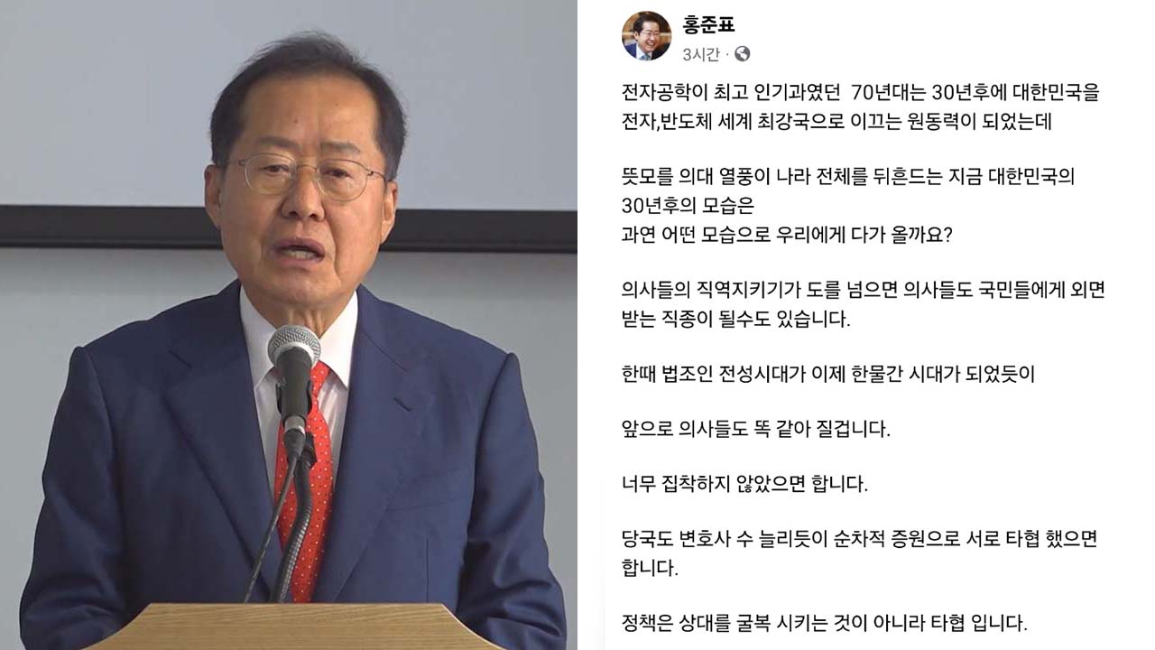 홍 시장은 2월 27일 자신의 SNS에 "의사들의 직역 지키기가 도를 넘으면 의사들도 국민에게 외면받는 직종이 될 수 있다"며 "법조인 전성시대가 한물간 시대가 되었듯 의사들도 똑같아질 것"이라고 지적했습니다.