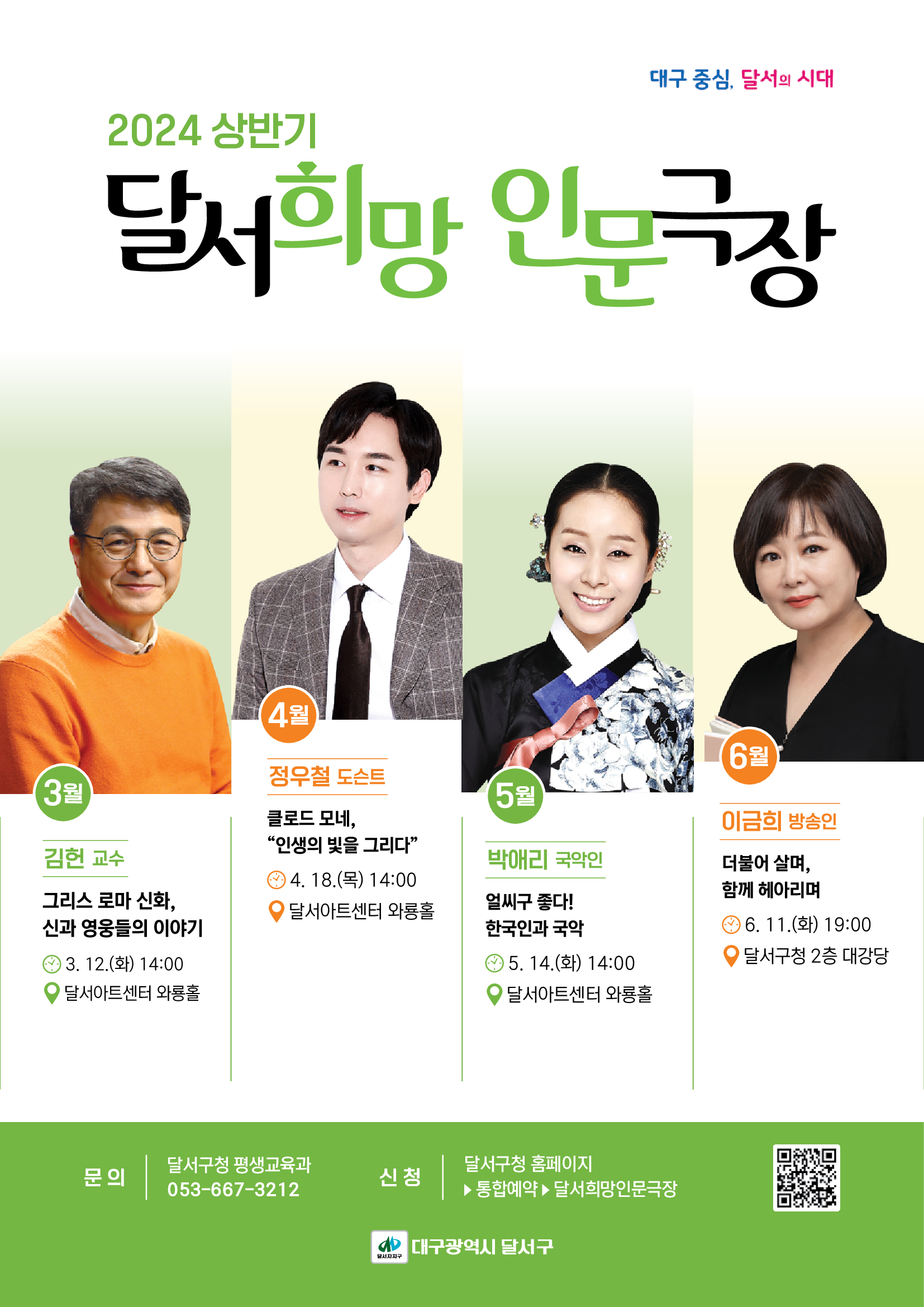 3월 12일 서울대 인문학연구원 김헌 교수의 그리스·로마 신화 강연을 시작으로 4월 정우철 도슨트, 5월 박애리 국악인, 6월 이금희 방송인의 인문학 강의가 열립니다.