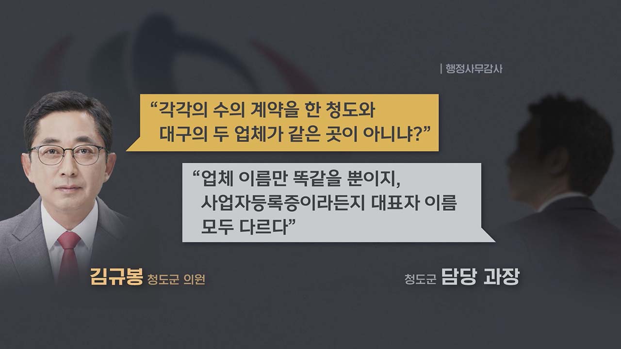 김규봉 의원은 각각의 수의 계약을 한 청도와 대구의 두 업체가 같은 곳이 아닌지 따져 물었고, 담당 과장은 "업체 이름만 똑같을 뿐이지, 사업자등록증이라든지 대표자 이름 모두 다르다"라며 문제없다고 답했습니다.