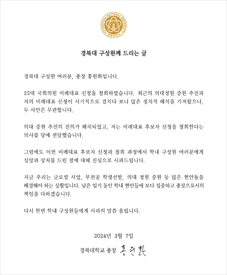 홍 총장은 이 글에서 "최근의 의대 정원 증원 추진과 저희 비례대표 신청이 시기적으로 겹치다 보니 많은 정치적 해석을 가져왔으나 두 사안은 무관하다"라며 "의대 증원 추진의 진의가 왜곡되었고 비례대표 후보자 신청을 철회한다는 의사를 당에 전달했다"고 설명했습니다.