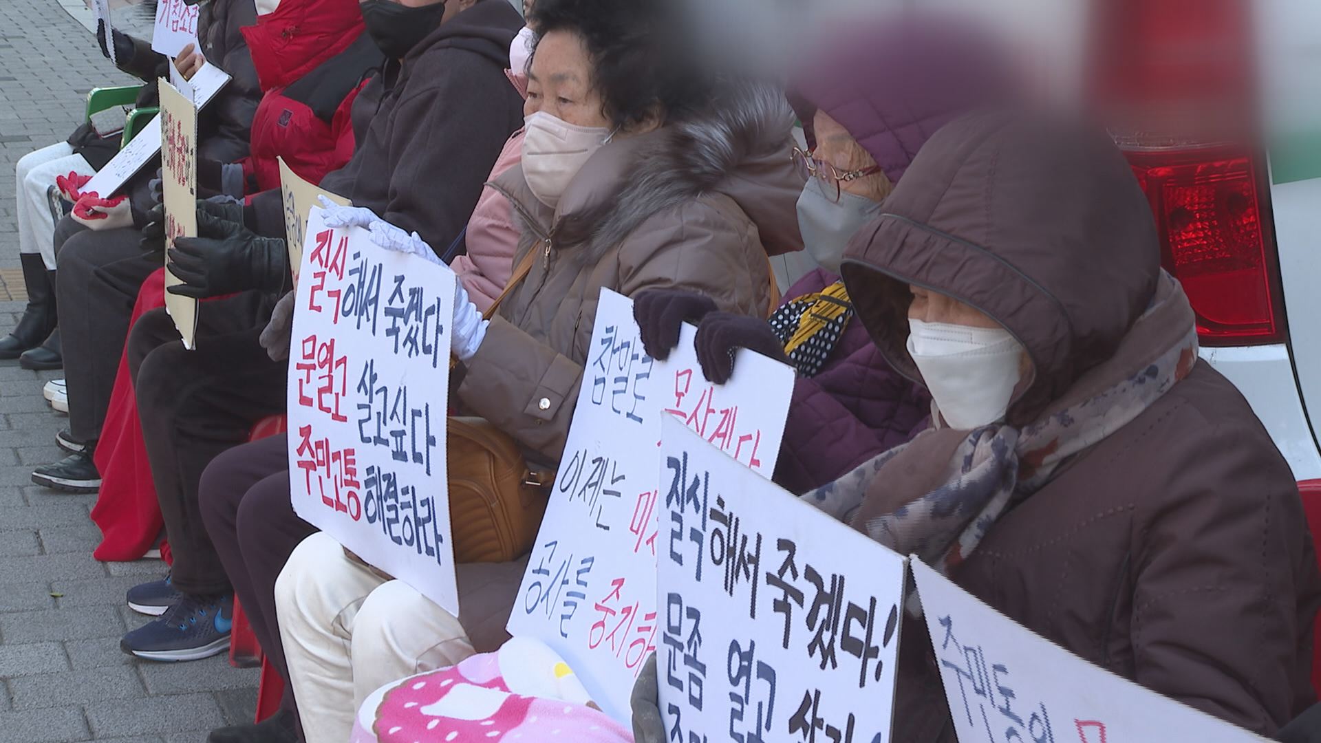 어르신들이 '참말로 못 살겠다, 공사를 중지하라' 등 피켓을 들고 거리로 나섰습니다.