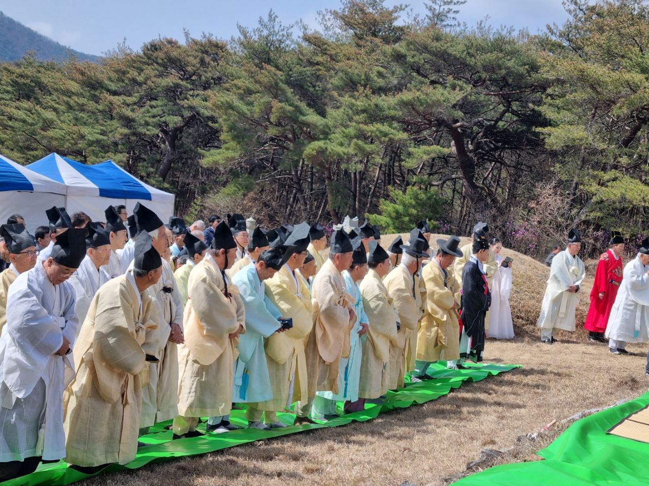 경북 영천 오천 정씨 문중은 3월 27일 영천시 자양면 성곡리에 있는 백암 정의번 시총에서 문중 관계자들이 참석한 가운데 고유제를 거행했습니다.