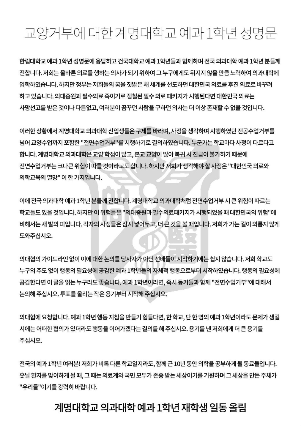 이들은 '교양 거부에 대한 계명대학교 예과 1학년 성명문'을 통해 "의대 증원과 필수 의료 죽이기로 점철된 필수 의료 패키지가 시행된다면 대한민국 의료는 사형선고를 받은 것이나 다름없다"고 정부의 의료정책을 비판했습니다.