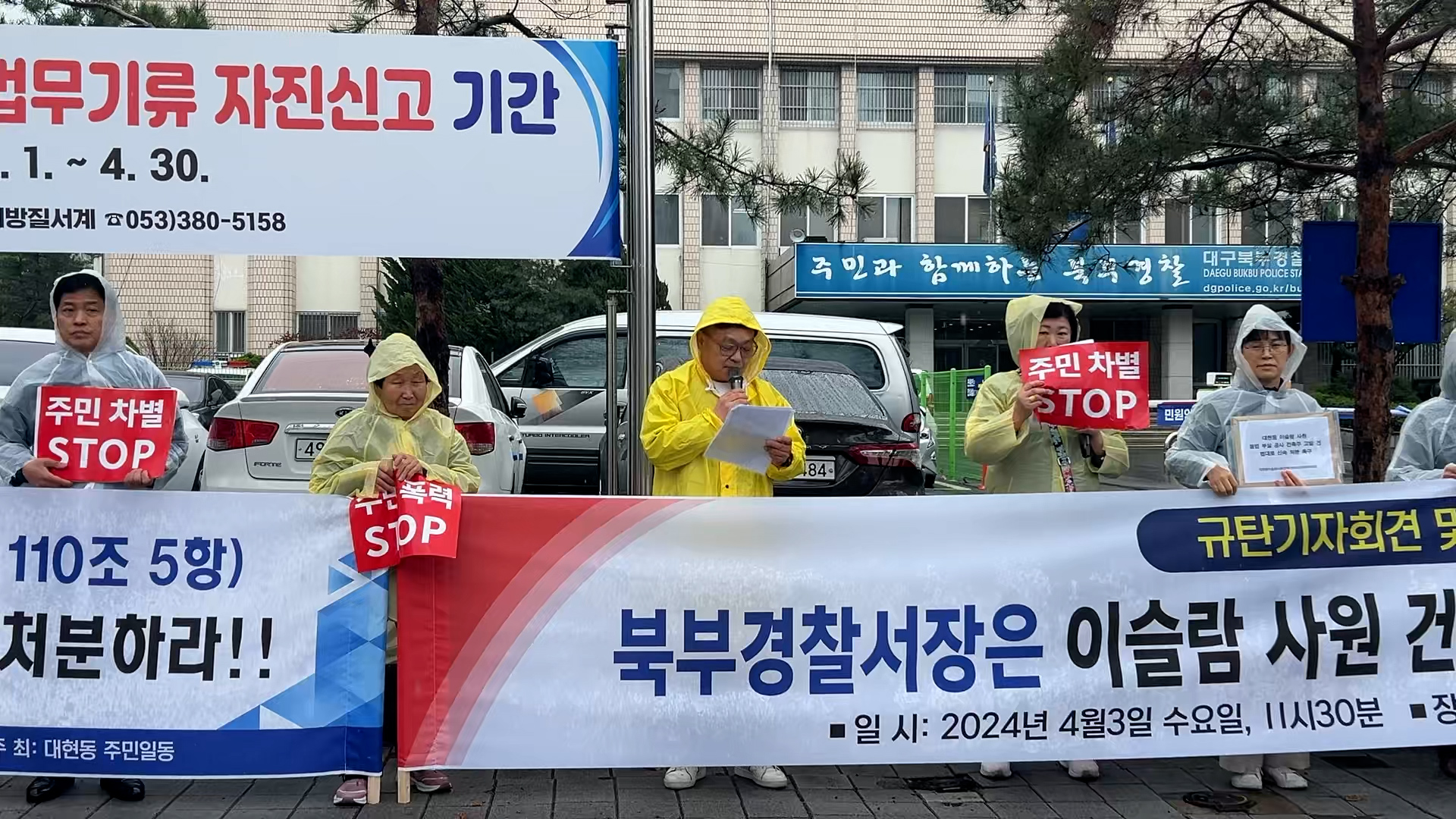 대구 대현동 이슬람사원 건립 반대 비상대책위원회가 4월 3일 오전 대구 북부경찰서 앞에서 기자회견을 열고 북구청이 건축주를 고발한 사건을 신속히 수사하라고 촉구했습니다.