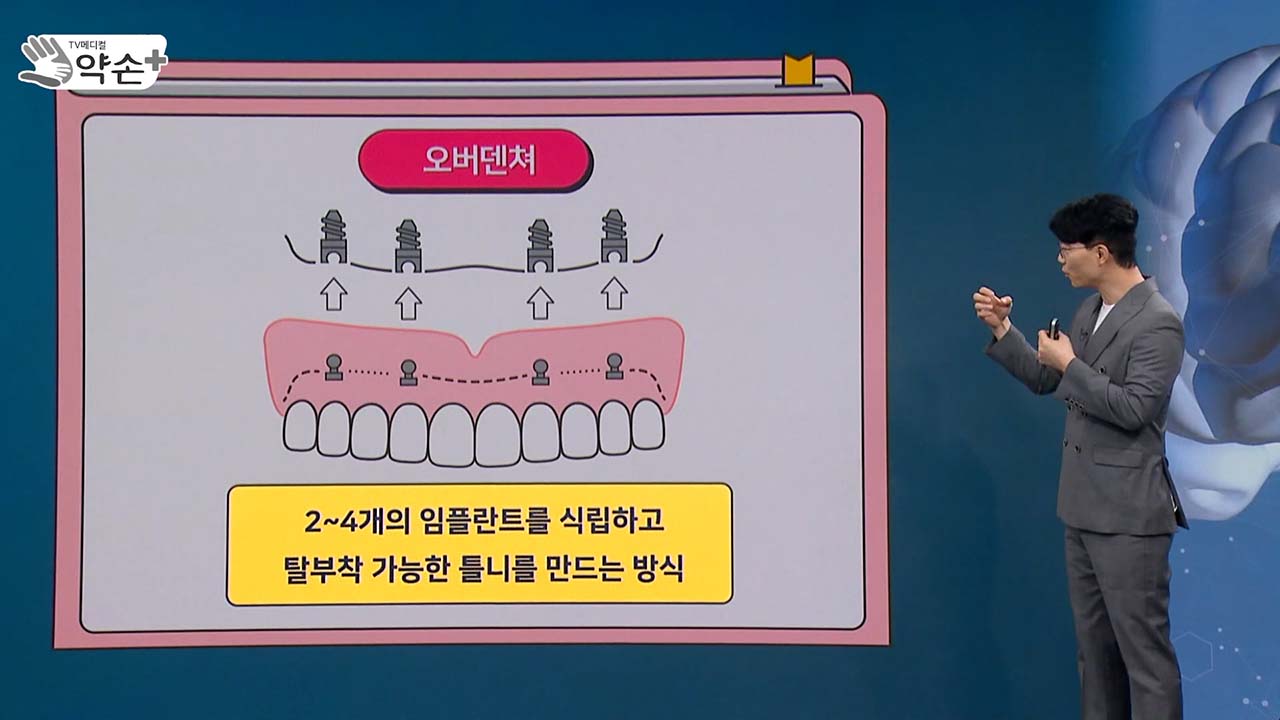앞서 보셨던 고정성 보철 치료에 비해서는 다소 불안해 보일 수는 있겠습니다만 그 치료법을 선택하지 못하는 환자들에게도 가용한 방법을 지금 설명하고 있는 것 같습니다. 또 하나의 가철성 보철 치료법이 ‘오버덴처’라는 것도 있던데?