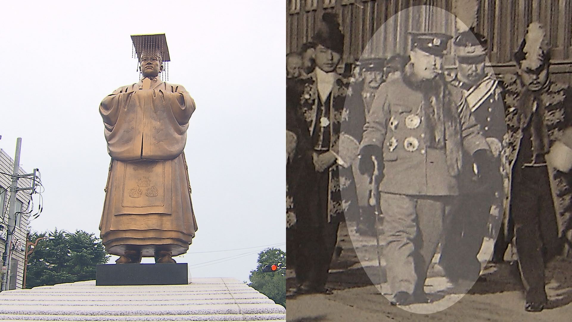 동상은 대례복을 입고 있지만 실제로는 당시 일본 제복을 입었고 친일 미화라는 비판이 쏟아졌습니다.