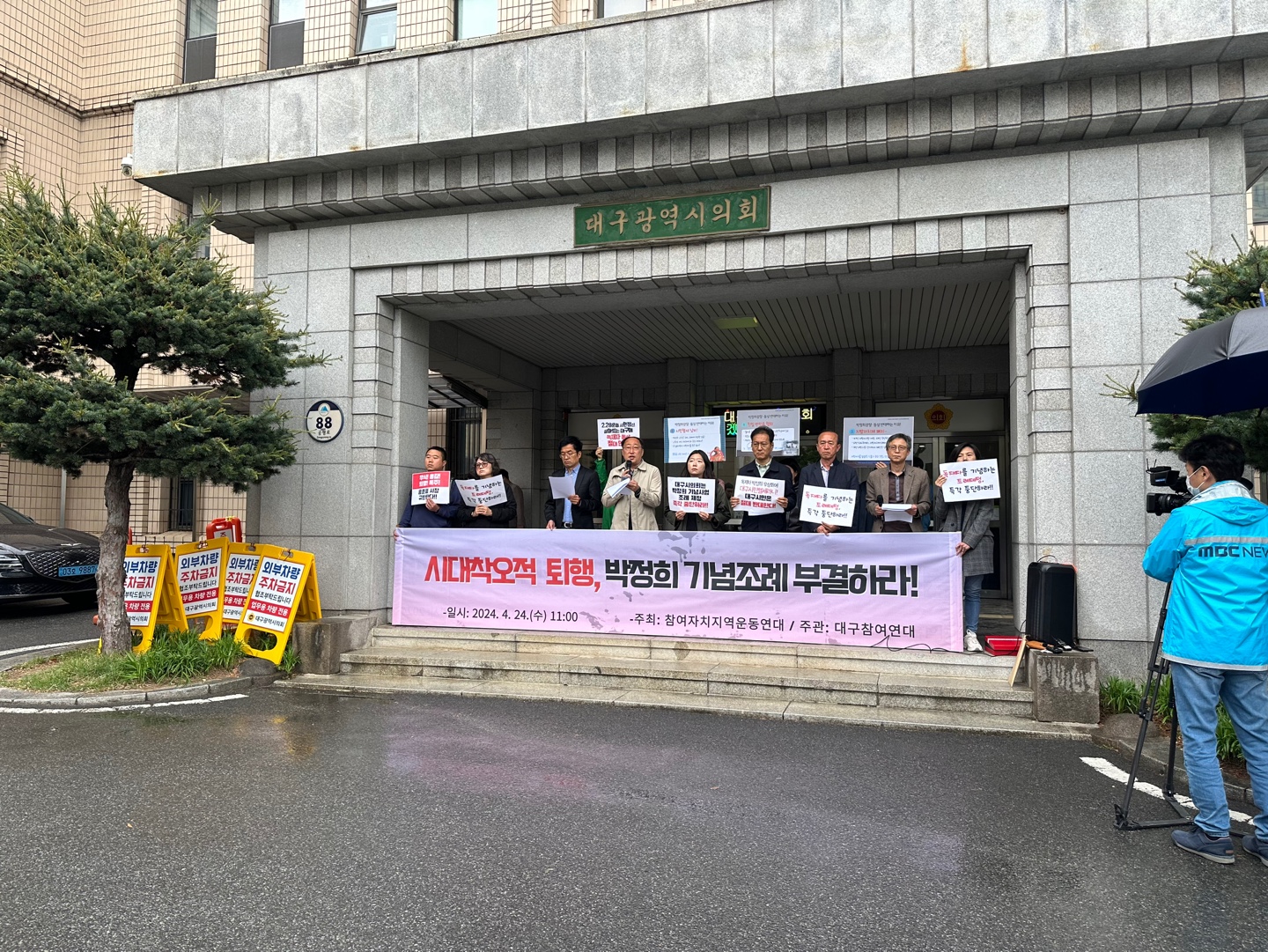 부산, 울산, 인천 등 18개 지역 운동단체는 4월 24일 오전 11시 대구시의회 앞에서 기자회견을 열고 "경제 성장의 성과가 있다고 하더라도 유신 독재와 국민 기본권 억압을 밑거름으로 이룬 것을 치적으로 내세우며 동상까지 건립할 일인지 묻지 않을 수 없다"며 시대착오적이라고 비판했습니다.