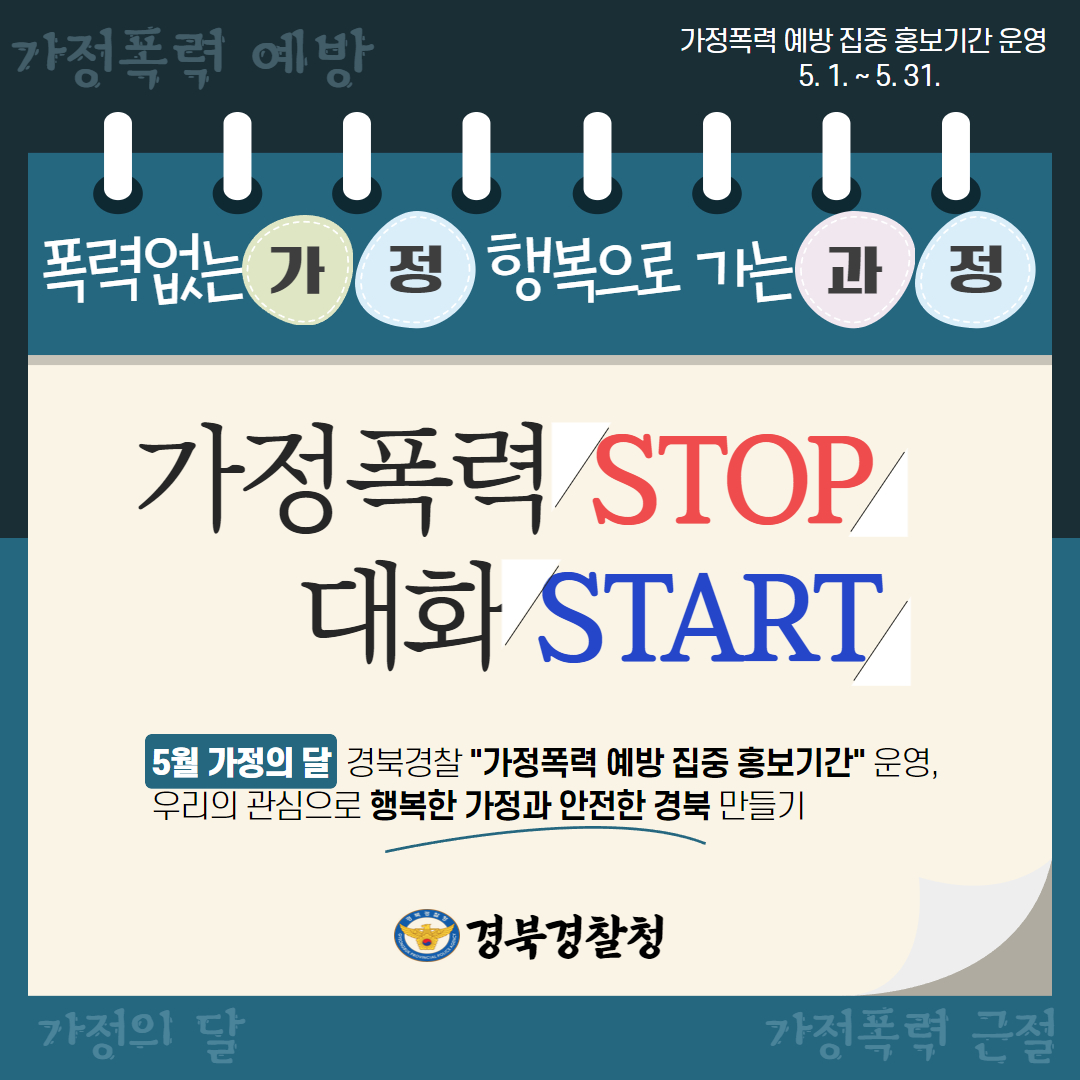 경북경찰청 5월 한 달 동안 '가정폭력 예방 집중 홍보 기간'을 운영합니다.