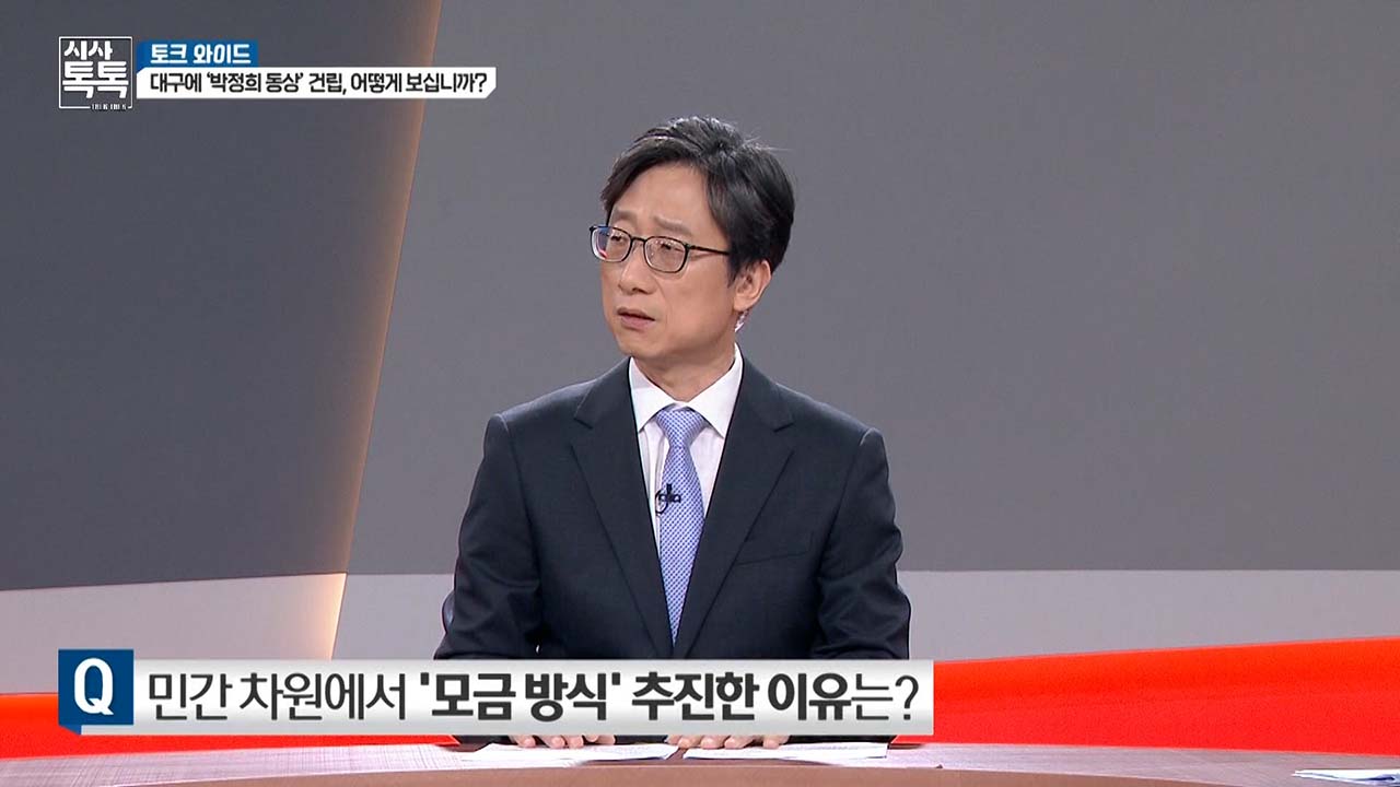 도시 전체의 자랑 혹은 도시에 좋아하는 사람들의 자랑이라고 하더라도 반대하는 사람들의 입장까지 들어가면서 건립한 것과 의견을 듣지 않고 건립한 것은 상징물이 조성되었을 때 발휘할 수 있는 힘의 차이가 있다는 지적이신데요. 그래서 원래 박정희 대통령 동상 건립추진위원회는 세금 말고 ‘만원의 기쁨’이라는 모금 운동으로 동상을 건립하겠다. 이렇게 추진하셨던 것 같은데요. 모금 방식 선택한 이유는 잠깐 짧게 말씀하셨습니다만 특별히 모금을 선택한 모금이라는 형식을 선택한 이유는 어떤 것입니까?