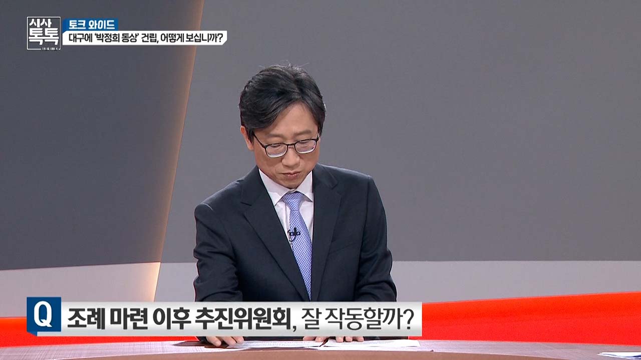 그 점에서 문제가 있었고 지금 일단 의회가 통과된 이상 그걸 반대해서 폐지도 할 수 있지만 지금이라도 좀 다양한 의견, 오늘 이런 방송 토론도 그런 것처럼 그래서 진짜 우리가 정말 위대한 박정희 대통령은 이 지역 출신 있는데 이 동상 하나 못 세우고 있는 거예요. 부끄럽다는 것에 그냥 세우는 게. 저쪽에 세우는 게 부끄럽다고 하지만 저희들은 세우지 않는 게 부끄럽다. 이래 보는 겁니다. 여론조사가 나타났잖아요. 7 대 3이. 여론조사가 조작이 아니라면 이건 이미 이거는 대세는 기울어졌으나···