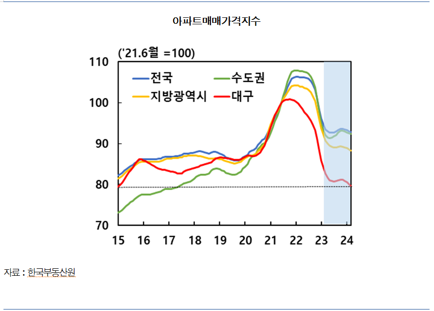 2021년 6월의 아파트 매매 가격지수를 100으로 봤을 때, 대구의 아파트 매매가격 지수는 3년째 전국에서 가장 낮은 수준인데, 2024년 1분기에는 80까지 떨어졌습니다.