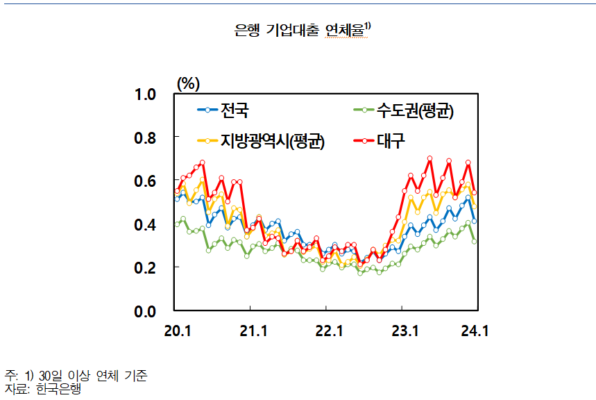 고금리는 부동산을 비롯한 전반적인 수요 감소를 가져왔고 이는 생산과 고용 감소로 이어지면서 은행들의 기업 대출 연체율은 대구가 전국 최고 수준입니다.