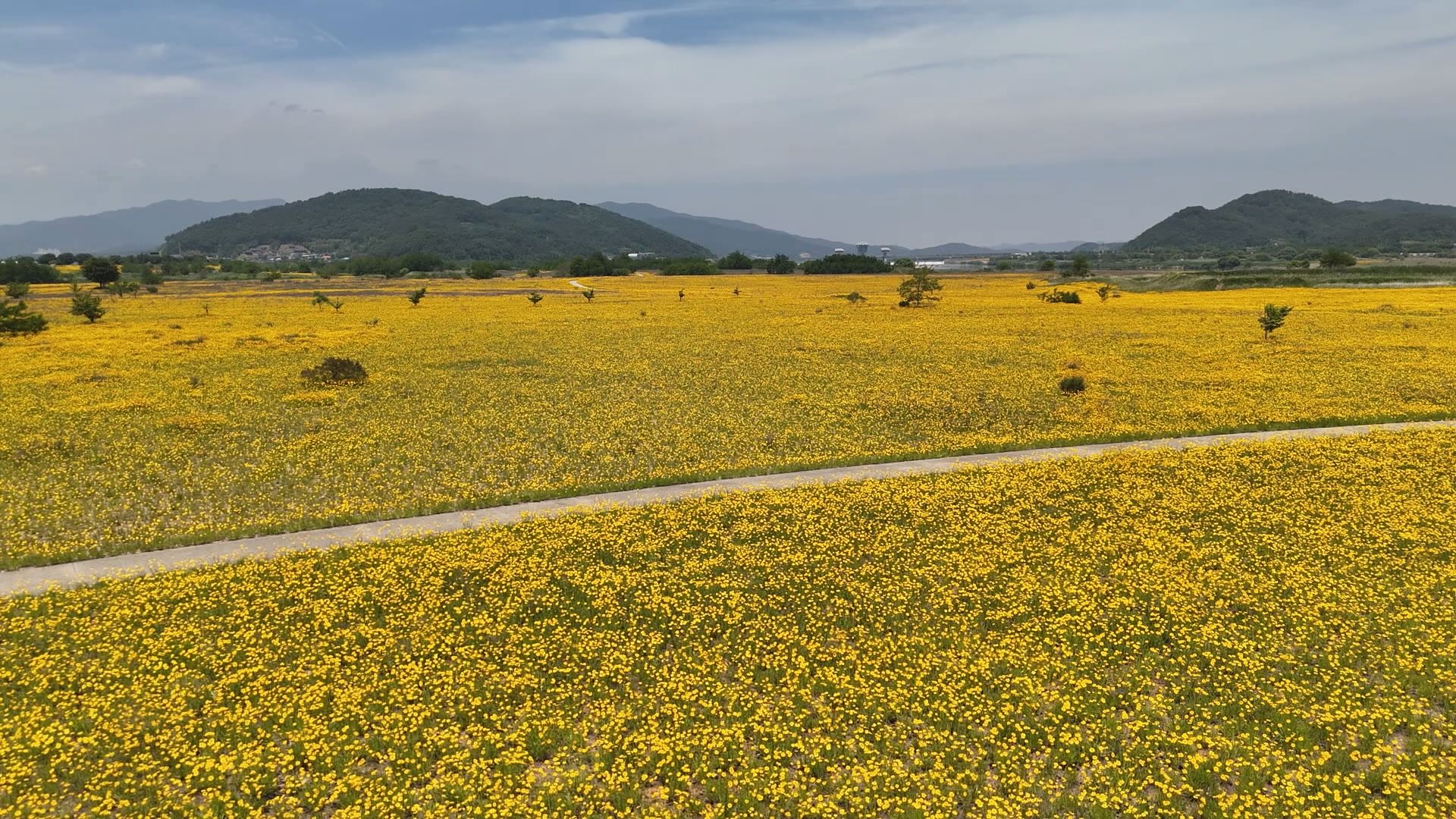 경상북도 구미시 고아읍에 있는 낙동강변의 수십만 제곱미터의 넓은 평지에는 노란색 꽃으로 물들인 풍경이 한눈에 들어옵니다.