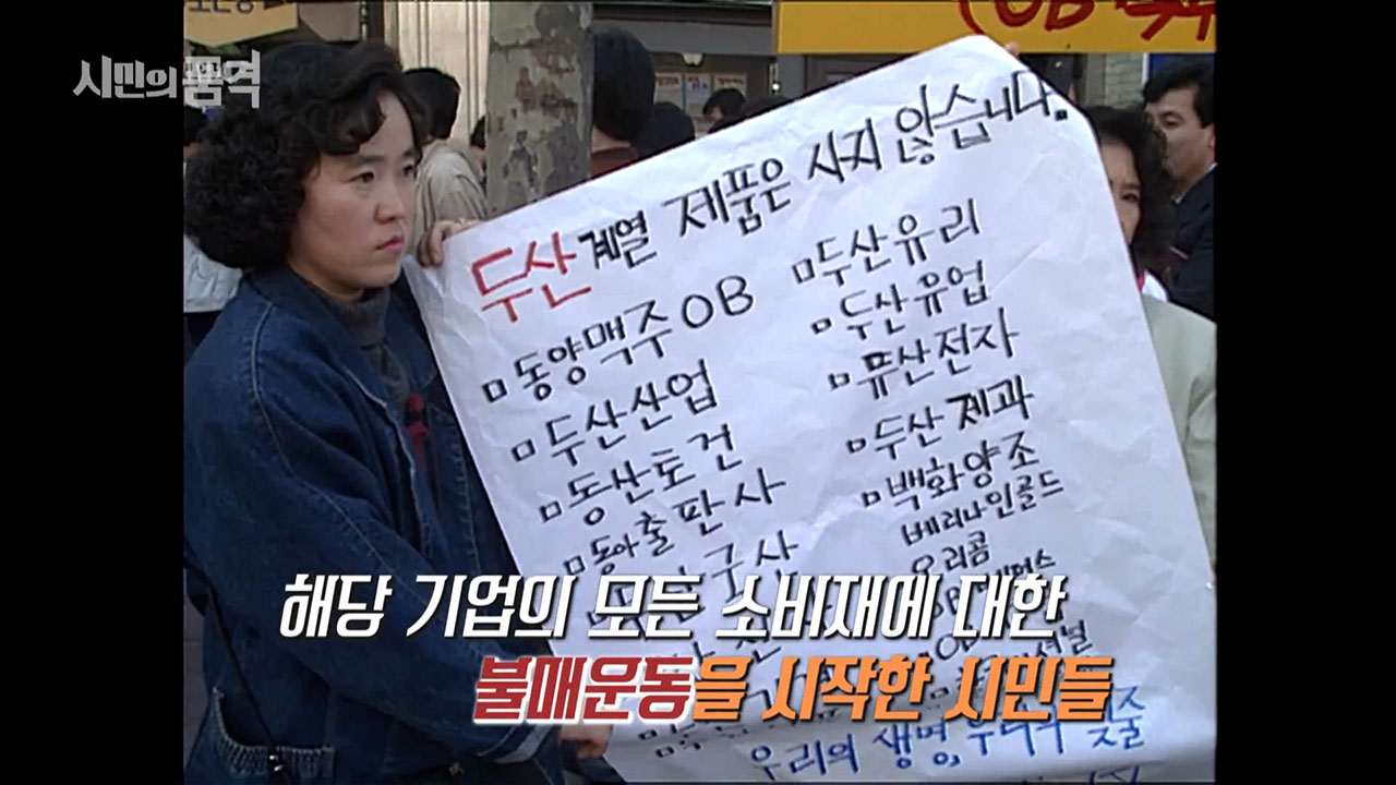 OB맥주뿐 아니라 두산의 전 제품 불매 운동도 벌어졌는데요, 전국 슈퍼마켓 연합에서는 두산 제품의 판매를 중단하기로 했고, 피해 사례 접수와 보상 서명 운동, 관계기관 및 기업 고발 조치 등 두산그룹 전체에 대한 전 국민의 항의가 이어졌습니다.