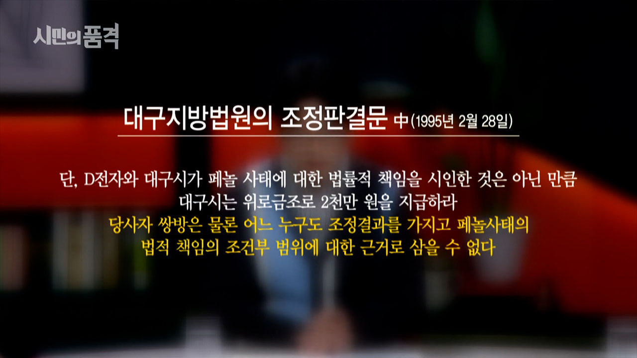 2년여의 지루한 공방 끝에도 결론을 내리지 못하자 결국 1995년 2월 28일 대구지방법원의 조정판정으로 종결이 됩니다. 재판부는 '두산전자는 대기업으로서의 사회적 역할을 감안해 대구시를 통해 1억 2천만 원을 페놀 피해 임산부 모임에 지급하고 대구시는 위로금 조로 2천만 원을 지급하라. 단 두산전자와 대구시가 페놀 사태에 대한 법률적 책임을 시인한 것은 아닌 만큼 당사자 쌍방은 물론 어느 누구도 조정 결과를 가지고 페놀 사태의 법적 책임의 조건부 범위에 대한 근거로 삼을 수 없다'고 판단했습니다. 사건 당시 수돗물의 페놀 및 클로로페놀의 농도를 정확히 알 수 없고 이것이 태아에 미치는 영향에 대해 누구도 장담할 수 없다는 것이 당시 결론이었던 겁니다.