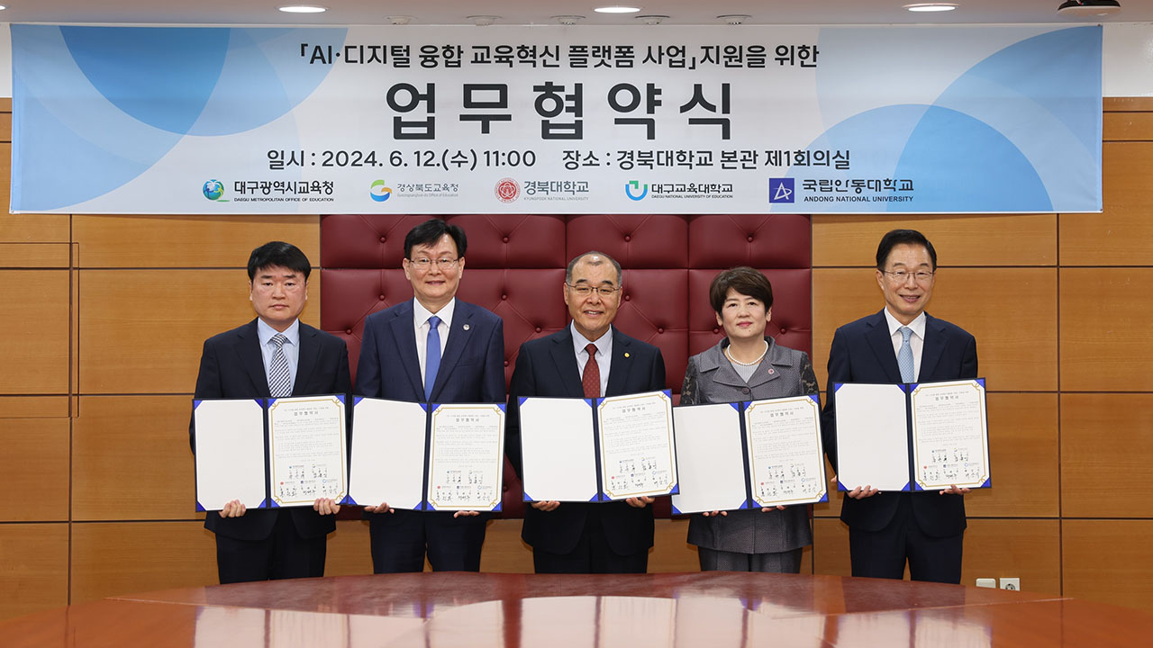 경북대와 대구·경북 교육청, 대구 교대, 국립 안동대 등 5개 기관은 6월 12일 경북대 본관 제1회의실에서 AI 디지털 융합 교육혁신 플랫폼 사업의 성공적인 추진을 위한 업무협약을 체결했습니다.