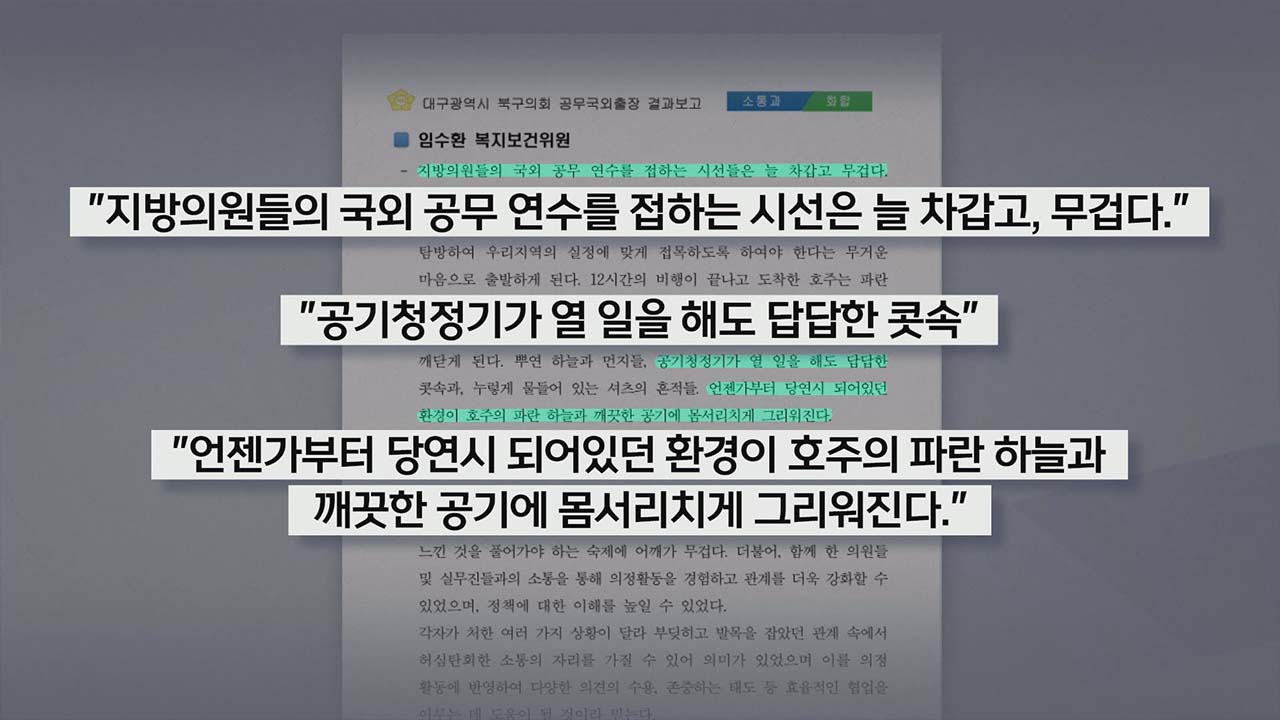 조광현 대구경실련 사무처장 "여전히 지방의원들은 해외 연수를 특권으로 생각하는 경향이 있고요. 문제가 생겼을 때 여기에 대해서 책임을 묻지 않고 있습니다. 공천을 해 준 정당도, 뽑아준 유권자들도요. 의원들의 해외연수가 직접적으로 정책에 관련이, 반영이 되거나 그런 부분은 거의 없다고 생각이 들고요."