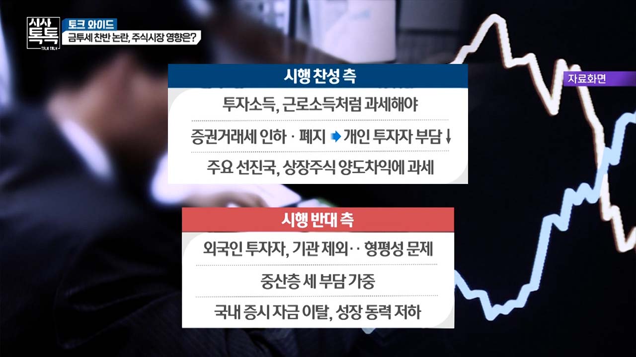 하지만 외국인 투자자와 법인세를 내는 기관을 제외하는 형평성 문제, 연말정산이나 건강보험 등에 영향을 끼쳐 오히려 중산층의 세 부담을 키울 것, 국내 증시 자금 이탈로 인한 주가 하락, 증시 부진으로 '단타'가 성행할 것이라는 우려와 반대도 만만치 않습니다.