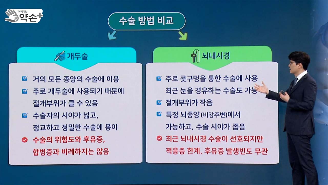 내시경을 선호하는 분들이 내시경을 해달라고 한다 해도 그 수술이 안 되고 개두술을 해야 하는 경우가 있고요. 반대로 개도술을 한다고 해서 내시경보다 위험하다는 생각은 절대 안 하셨으면 좋겠습니다.