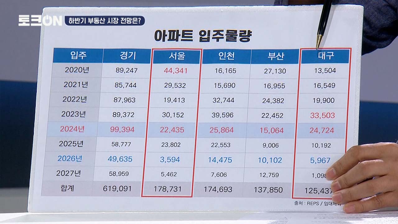 이걸 생각해 보게 되면 우리가 지금 당장은 어려운 것은 맞습니다마는 주택이, 아파트가 필요하다고 해서 빵처럼 찍어낼 수 있는 게 아니잖아요. 지금 공급한다고 하더라도 2026년도에 공급이 불가능합니다. 그래서 지금 서울, 수도권 쪽에는 서울에 인구가 저렇게 많이 있는데 2026년도 입주 물량이 3,500세대밖에 없다고 하면 올라가는 거죠. 심리가 받침이 되는 겁니다.