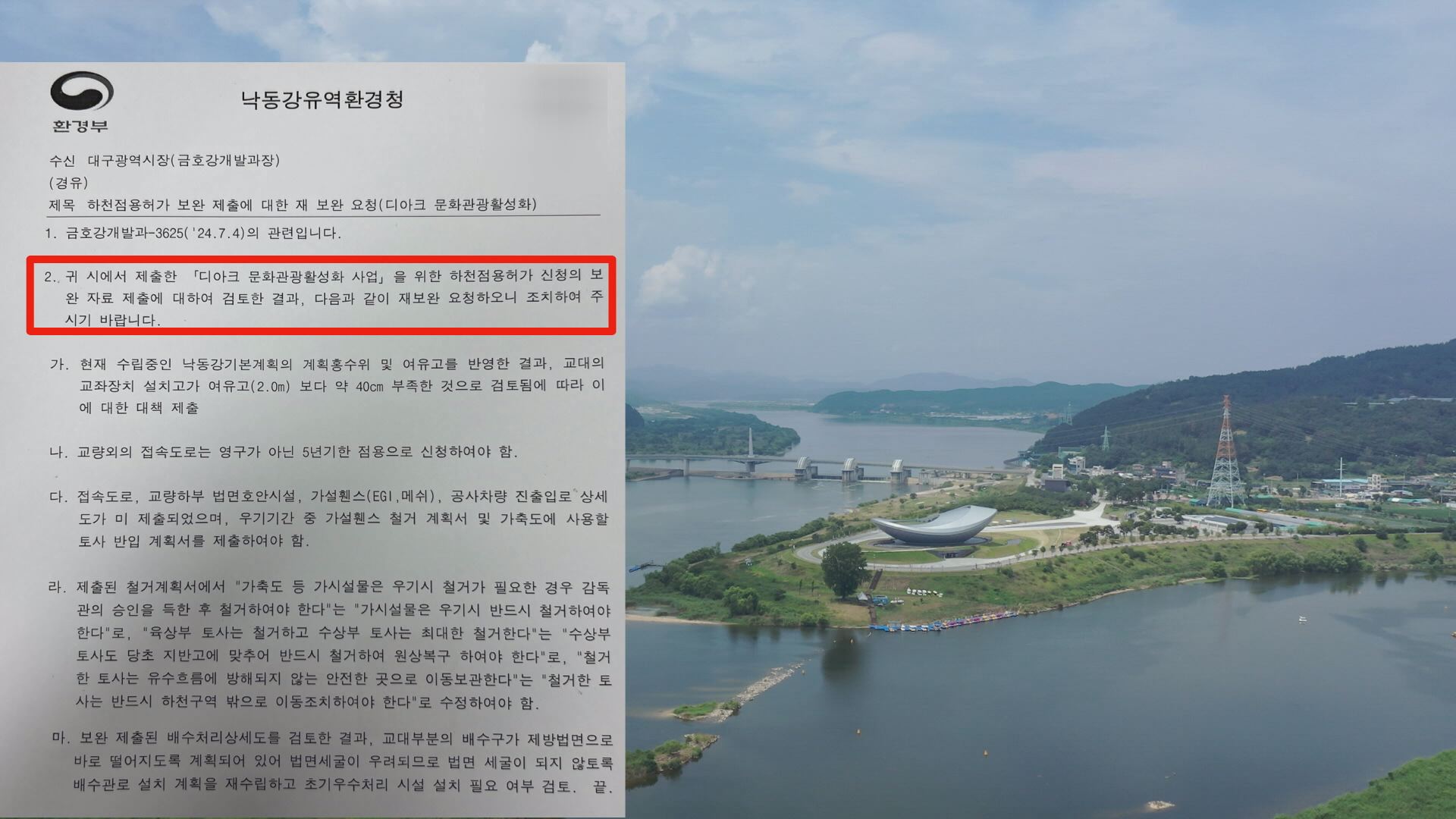 낙동강유역환경청은 지난 7월 16일 대구시에 하천 점용 허가에 대한 재보완을 요청하는 공문을 보냈습니다.