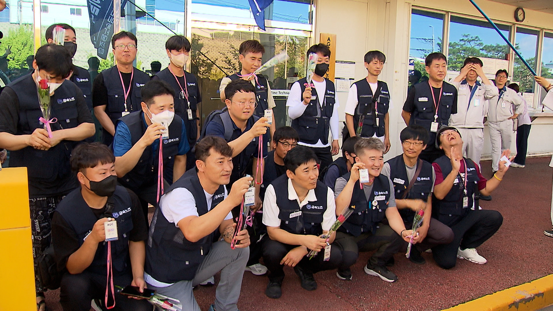 설레는 발걸음, 입구에서 출입증을 받아 들고는 노동자들이 함박웃음을 지었습니다.