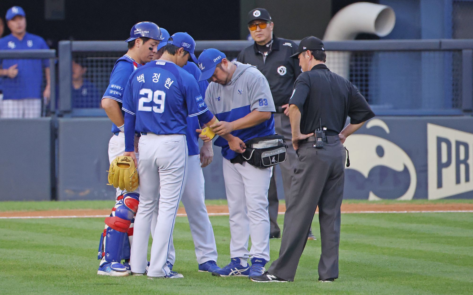 무사 만루 상황에서 나온 강한 직선타에 팔을 맞은 백정현은 깔끔하게 아웃카운트를 챙기더니, 오른팔 통증에도 김현수를 병살타로 잡고, 이날 경기 최대 위기에서 탈출합니다.