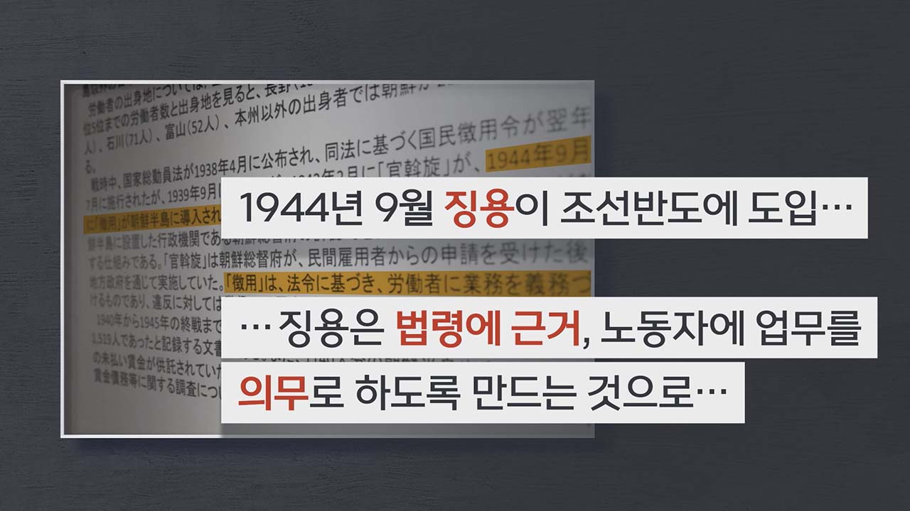 특히, 징용은 전쟁 당시 공포, 시행된 국가총동원법이 조선 반도에 도입됐고, 징용은 법령에 근거해 노동자의 업무를 의무 하도록 했고 이를 어기면 부역이나 벌금을 부과했다며 '강제'가 아닌 합법적으로 읽히게 했습니다.