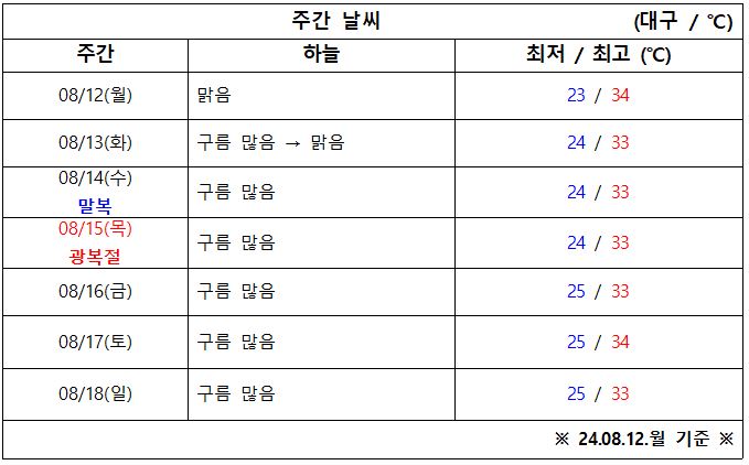 8월 2주 차 아침 기온 23도에서 25도, 낮 기온 33도에서 34도 예상됩니다.