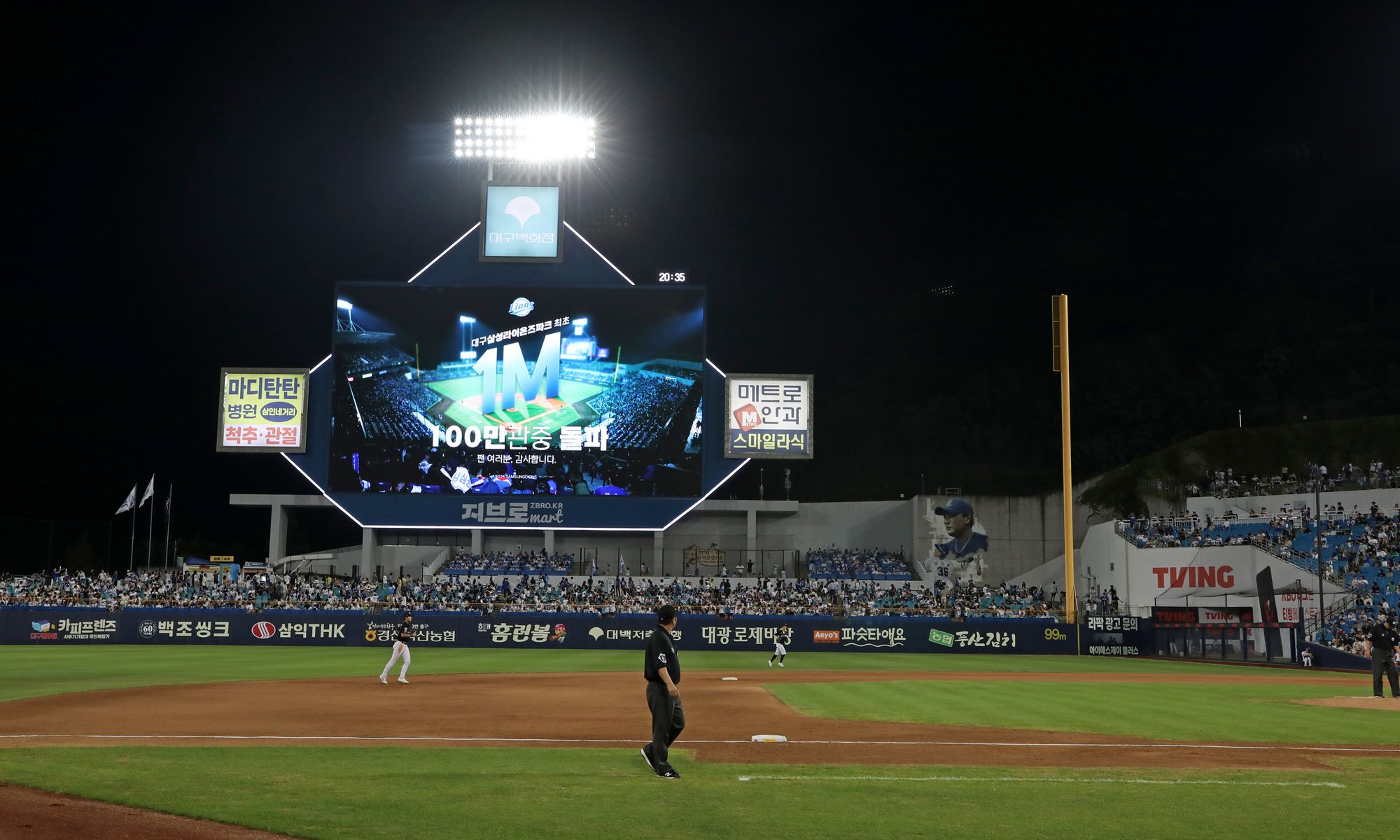 KT와의 주중 시리즈에서 연승으로 일찌감치 위닝시리즈를 확정 지은 삼성은 이날 찾은 20,435명의 관중으로 홈 58경기 만에 100만 관중 돌파에 성공합니다.
