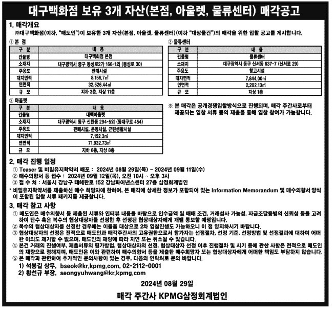 대구백화점은 8월 29일 자 조간신문 3곳에 매각 주간사인 KPMG삼정회계법인 명의로, 보유 중인 3개 자산을 매각한다고 공고했습니다.
