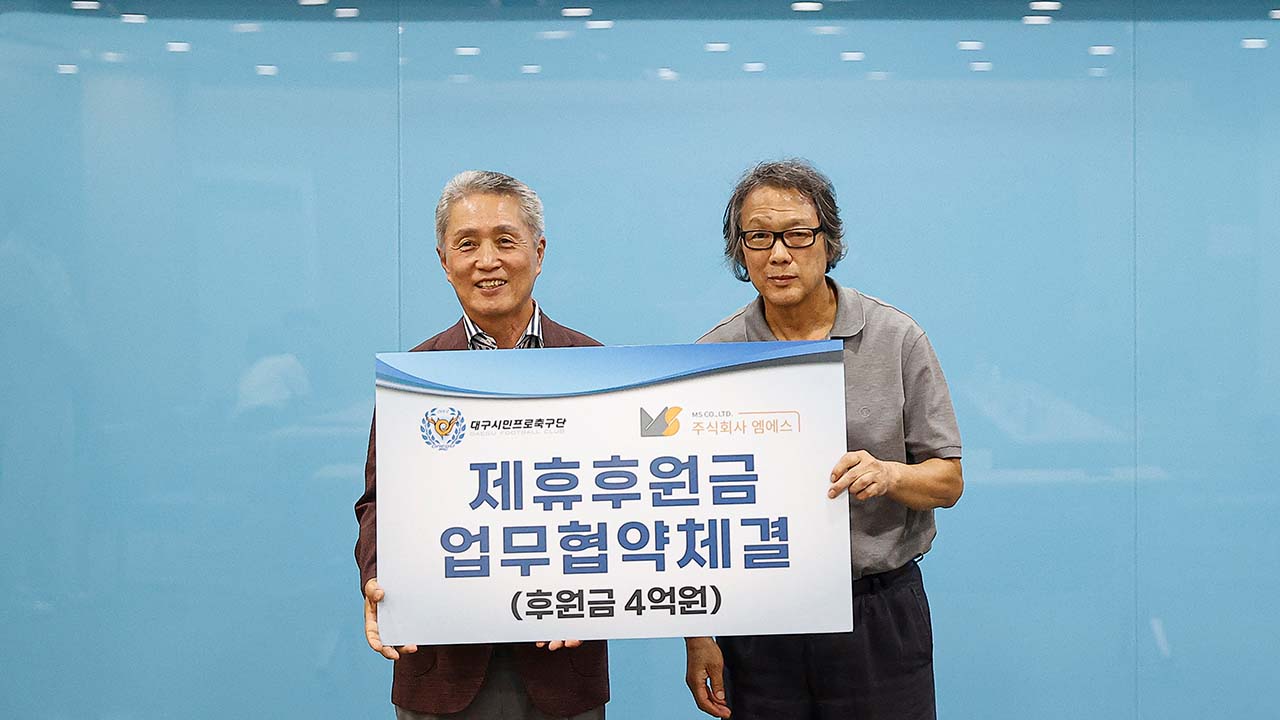 메인 스폰서인 IM뱅크(DGB대구은행)을 비롯해 대구한의대학교와 대성에너지, 대구로 등 대부분의 주요 스폰서는 지역 기업이 주를 이뤘던 대구FC는 최근 수도권과 충청 지역을 기반으로 한 산업용 세정제 전문 기업 주식회사 MS와 현물과 현금을 포함, 4억 원 규모의 후원 계약을 체결했습니다.