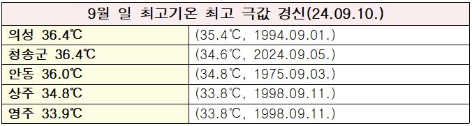 특히 화요일 의성과 청송의 낮 최고 기온은 36.4도까지 올라 역대 9월 일 최고기온 1위를 경신했고요.