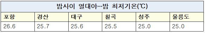※ 열대야 : 밤사이(18:01~다음날 09:00) 최저기온이 25℃ 이상 유지되는 현상(다음 날 아침 09시까지 기온이 25℃ 미만으로 떨어질 경우 열대야 기록이 변경될 수 있음)