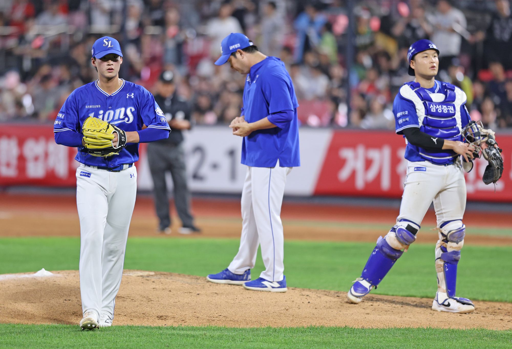 포스트시즌 불펜 투입을 감안해 등판한 백정현부터 김대우, 이재익까지 3명의 투수가 2실점으로 아쉬움을 남긴 삼성은 8회 올라온 김태훈이 홈런 포함 3점을 더 내주며 효과를 알 수 없는 투수 교체가 이어갑니다.