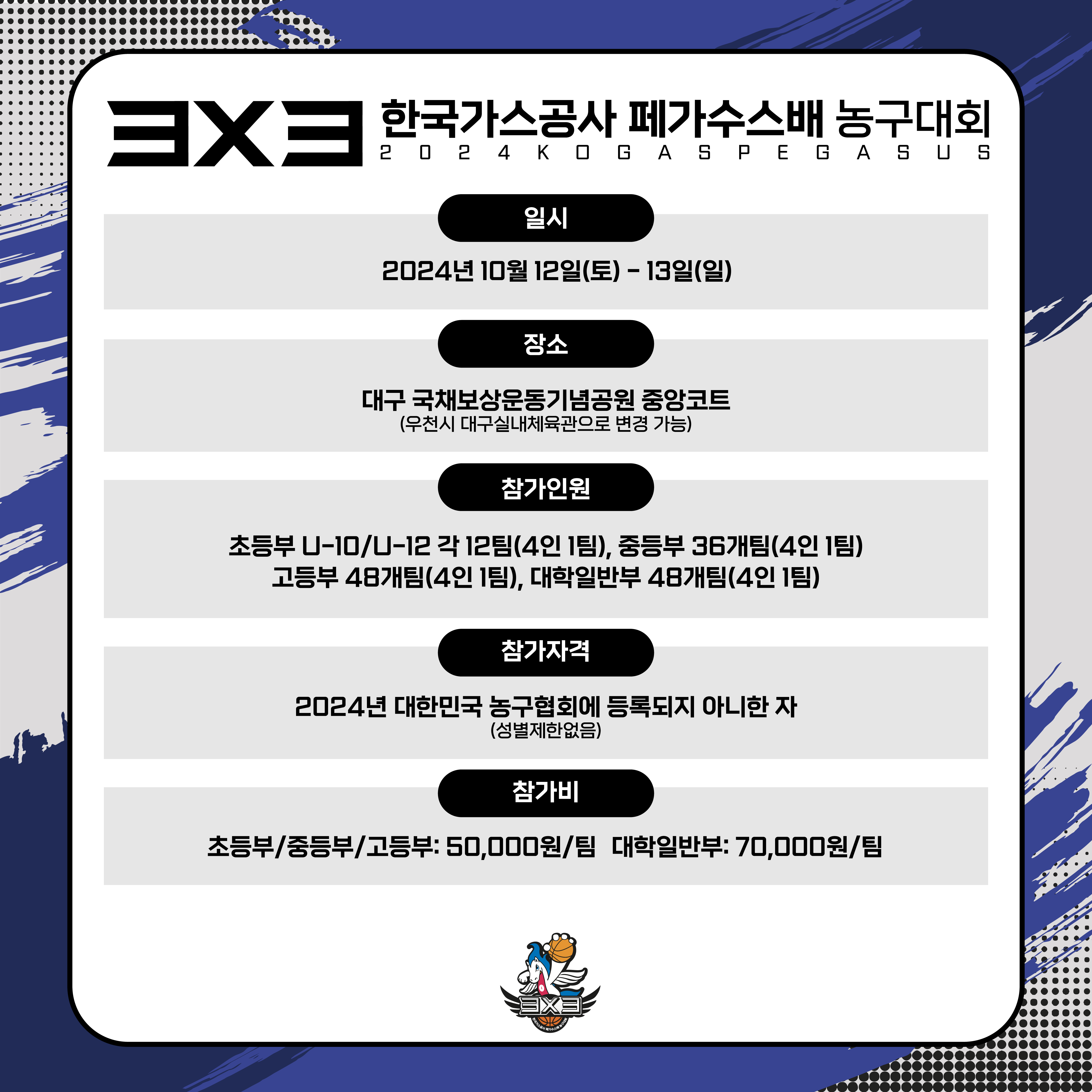 10월 12일부터 13일까지 이틀간 대구 국채보상운동기념공원 중앙 코트에서 펼쳐지는 '제1회 페가수스배 3X3 농구대회'는 한국가스공사 페가수스 농구단 창단 이후 처음 개최되는 행사이자, 대구와 경북 지역 최대 3X3 대회로 펼쳐집니다.