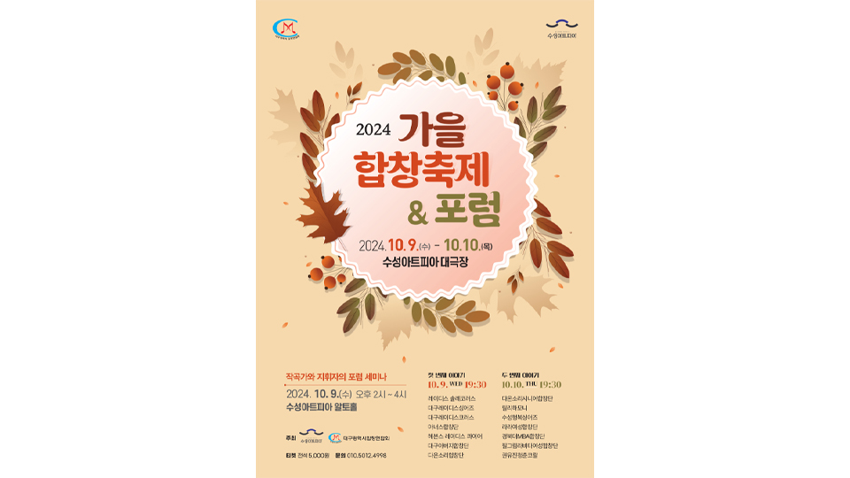 대구 수성아트피아는 2024년 두 번째 합창제 '가을 합창 축제'를 10월 9일과 10일 이틀간 저녁 7시 30분에 엽니다.